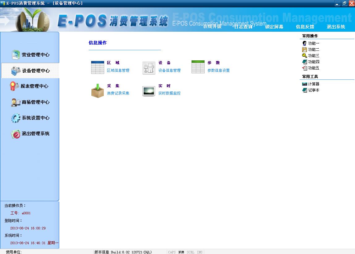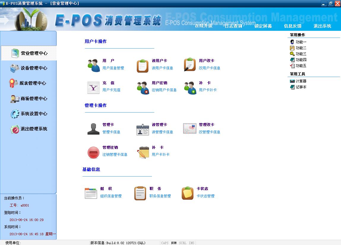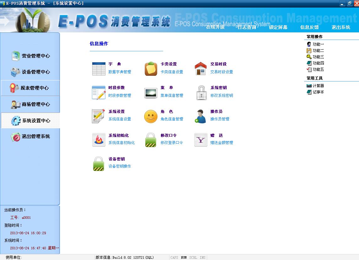E-POS智能消费管理系统是“永豪”公司专门针对餐厅、饭堂、商店、超市等消费场合设置的一款高级管理软件。它是以计算机管理为核心、以非接触式智能卡为信息载体的全新智能收费管理系统。E-POS智能消费管理系统实用于SQL Server 2000及以上版本的数据库,安装快捷、简单。系统主要由营业管理中心、设备管理中心、报表管理中心、商场管理中心(暂无功能)、系统设置中心五个大块组成。