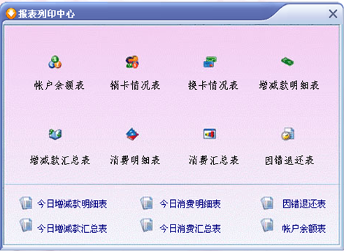 对于帐户余额信息、销卡/换卡信息、增减款明细及汇总、消费明细、消费汇总统计等以报表显示,另支持Excel格式导出,打印 |