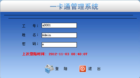 基本信息:添加区域、学校、人事、设备等信息。 个人控制面板:操作当前登录帐号资料。 校讯通:可以对学生、教师、司机等发布和查看通知,短信,公告。 家校互动平台:家长和学校进行沟通平台。 系统管理:对账户信息的管理。 报表:可以查看刷卡的数据。 二、C/S客户端 C/S客户端用于开卡,设备参数设置,数据采集,和对刷卡进行实时监控。 1、登录客户端:输入工号,按回车系统自动输入姓名,输入密码登入平台。