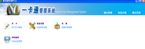 开卡:对在B/S客户端添加了信息的学生、教师、司机进行发卡。 设备设置:对刷卡设备进行相应的参数设置。 采集:对刷卡记录进行采集。 实时监控:打开实时监控,可以显示出所有的刷卡数据实时上传的信息和情况。 |